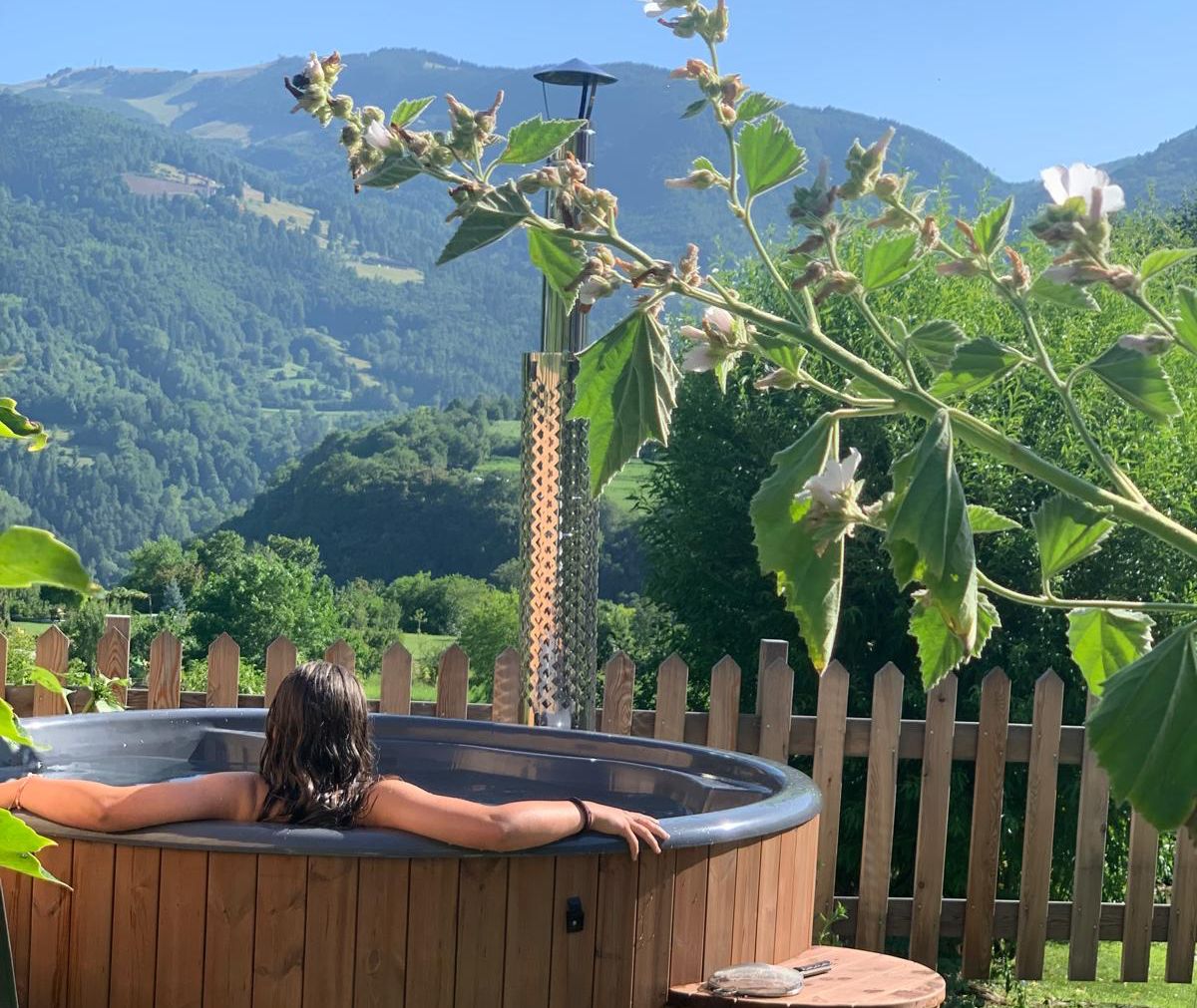 Bei Villa Monica steht Ihnen eine traditionelle Holzbadewanne im Freien zur Verfügung — beheizt mit Holz, umgeben vom Garten, mit Blick auf die Berge. Kein Spa, kein Hotel — einfach echte Erholung in einer ruhigen, privaten Atmosphäre.